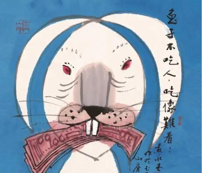 还有讽刺贪官的兔子。兔牙直接变獠牙,还叼着一沓钱,借此讽刺贪官吃拿卡要——“兔子不像人,吃相难看”。