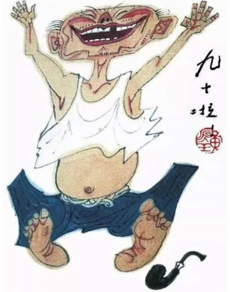就连画自己也是如此。赤着脚,穿着背心短裤张牙舞爪地大笑,庆祝自己九十岁生日。