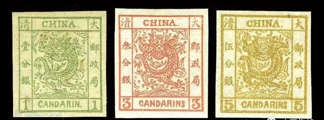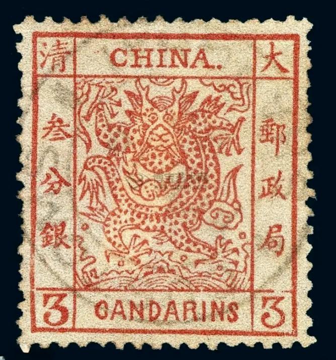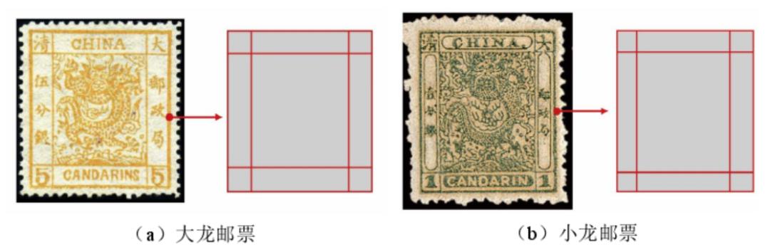 四条垂线把画面分成九个区域,王室象征物"龙"位于中间,顶部和底部分别是" CHINA "和" CANDARIN ( S )",左右两边分别是面值和"邮政局"字样,"大""清"两个字则在票面上方的左右两角。这种按比例分割的构图,目的就是均匀画面,王室位于中央,神圣不可侵犯。