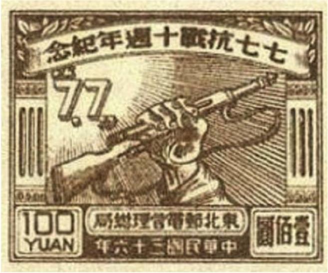 而韵律指的是各设计元素通过变化营造出的一种氛围,带入了情感成分,可以给人以精神上的满足与享受,甚至与人产生共鸣,增强设计的艺术表现能力。像1947年发行的七七抗战十周年纪念邮票。