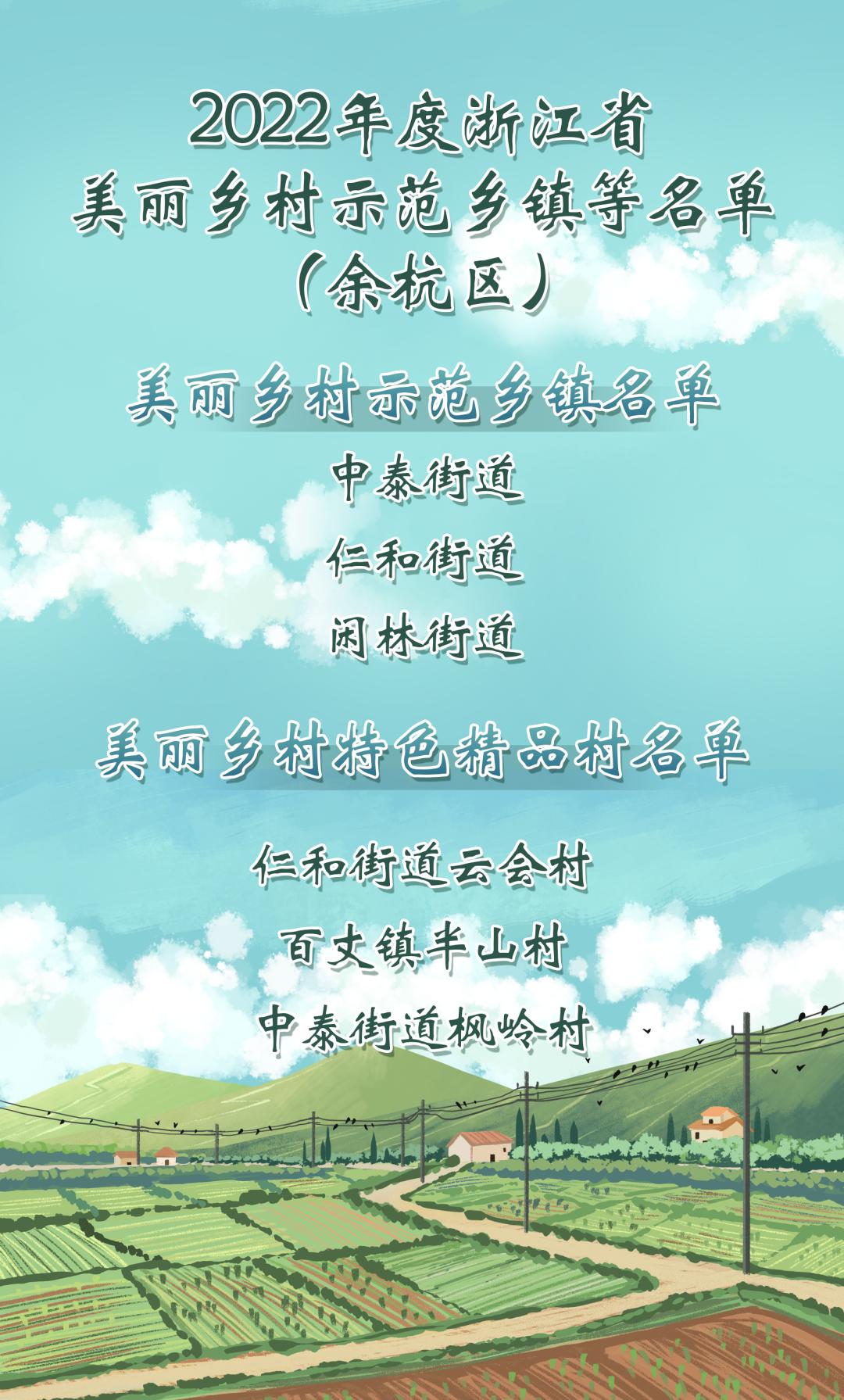 近日,浙江省“千村示范、万村整治”工作协调小组办公室公布了2022年度全省深化“千万工程”建设新时代美丽乡村(农村人居环境提升)工作优胜县等名单,余杭区中泰街道、仁和街道、闲林街道获评浙江省美丽乡村示范乡镇,仁和街道云会村、百丈镇半山村、中泰街道枫岭村获评浙江省美丽乡村特色精品村。