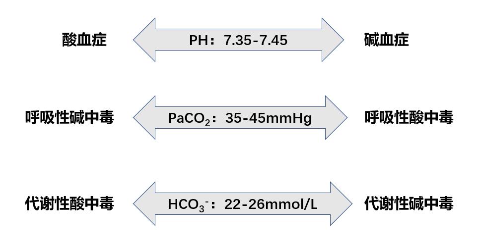 代酸、呼碱除pH外, PaCO2和HCO3-均下降;呼酸、代碱除pH外, PaCO2和HCO3-均升高;酸血症或碱血症一定有酸中毒或碱中毒;