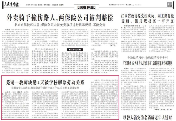 芜湖一教师缺勤4天被学校解除劳动关系芜湖市弋江区法院:解除劳动合同的行为不合法,应支付工资并赔偿
