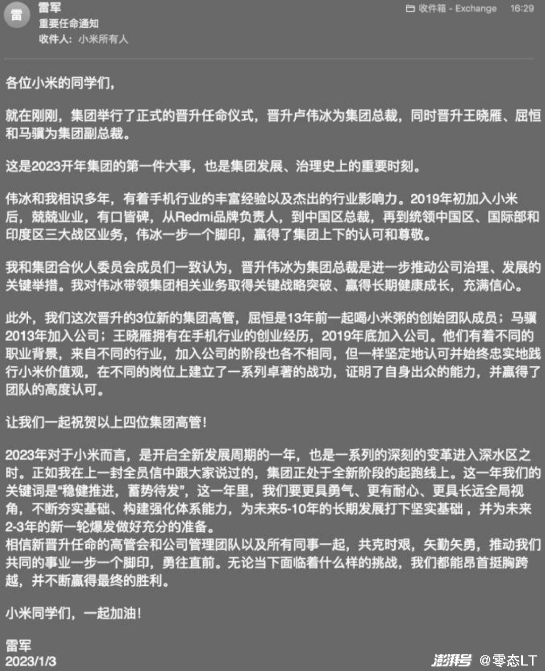 2023年1月3日,节后第一天,小米CEO雷军发布内部信,称小米集团刚刚举行了正式的晋升任命仪式,晋升卢伟冰为集团总裁,同时晋升王晓雁、屈恒和马骥为集团副总裁。