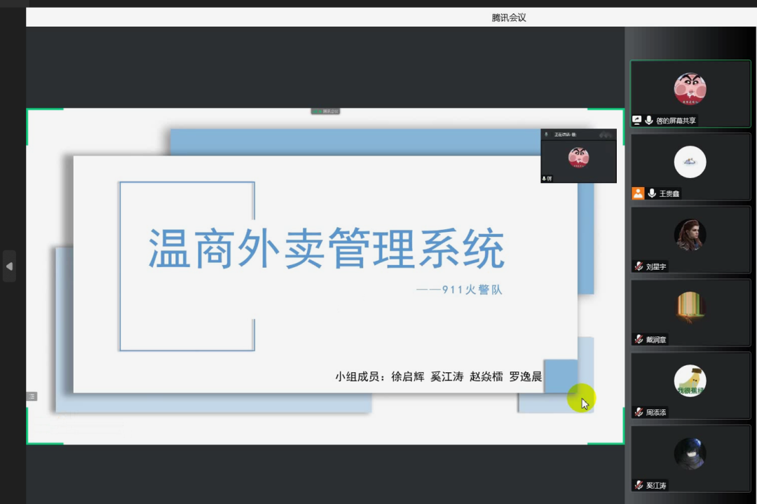 按照学习通里排好的小组顺序,每个小组汇报时间不超过15分钟,汇报的内容包括团队分工、项目实施过程、项目文档展示、项目效果展示等。在小组答辩过程中,我对答辩小组进行随机提问、指定提问,并展开激烈讨论,被点名的同学需立即上麦进行回答。通过对小组项目图文并茂的描述,同学门准确生动地展现了软件开发过程模型。此次项目答辩,不仅是知识总结的过程,更是对学过知识的沉淀和升华。随着小组汇报的深入,同学们渐入佳境,个个都表现出最好的自己,这也许是线上课程的一个优势。