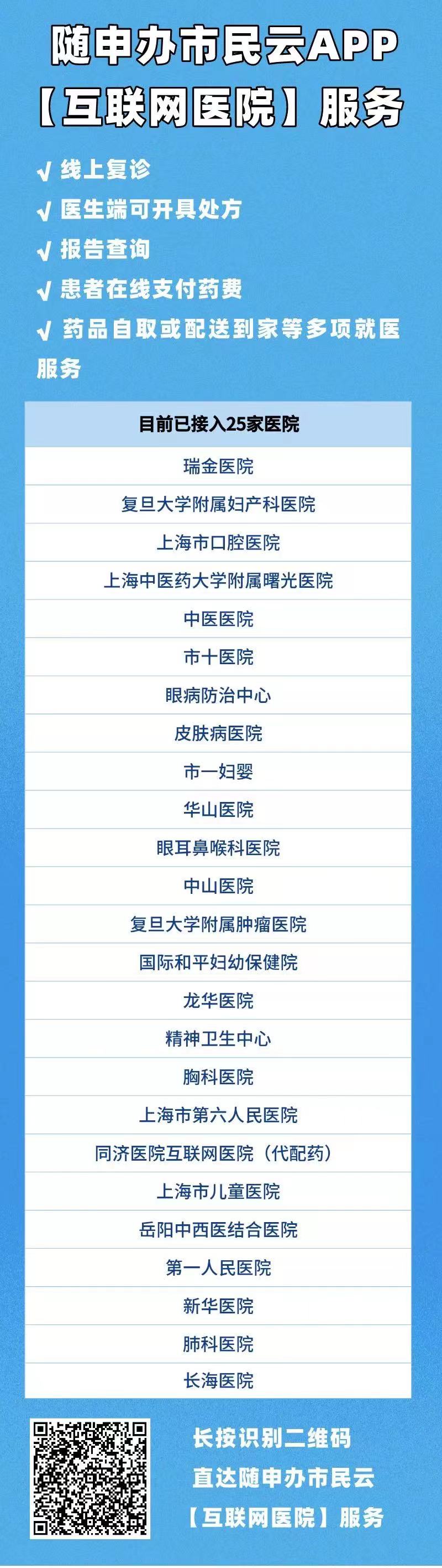 自国务院防联控机制出台“新十条”后,上海各级医疗机构平稳有序落实落细各项优化调整措施。作为上海“一网通办”总门户移动端,“随申办市民云”APP全力打造本市新型就医服务体系,现已接入本市25家医院和6个区的互联网医疗服务,向市民推出“互联网医院”应用服务,医保和自费的复诊患者本人和绑定亲属关系的家人,体验线上复诊、医生端可开具处方、报告查询、患者在线支付药费、药品自取或配送到家等多项就医服务!