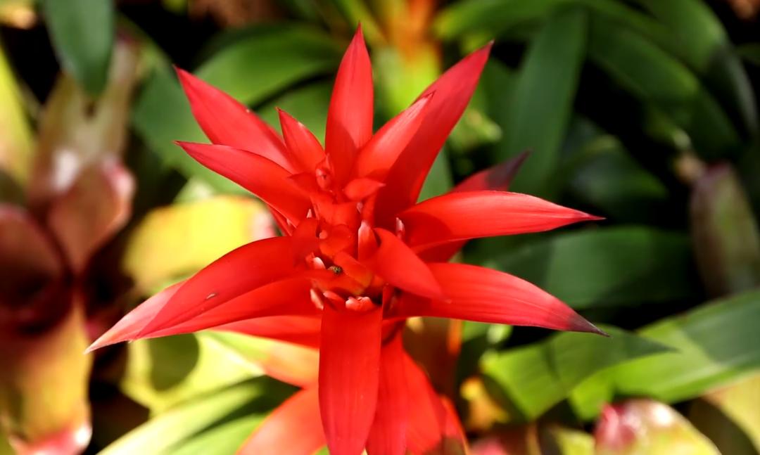 虽说名为“凤梨”,星花凤梨可不是大家心目中的菠萝。事实上全世界凤梨科植物有数千种,我们平常吃的菠萝确实是其中之一,但除了菠萝声名远播之外,凤梨科植物中还有众多的观赏品种,称为观赏凤梨。它们的叶多呈丛生莲座状,或有美丽的斑纹、斑点、镶边。圆锥花序或穗状花序由叶丛中抽生,艳丽而庄重,观赏期可达数月。