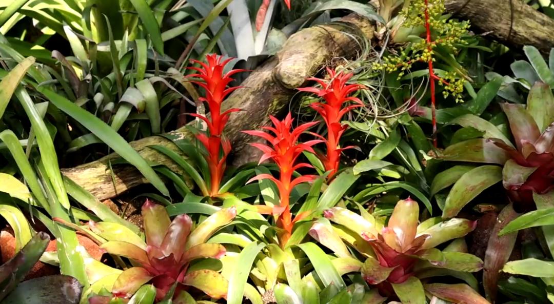 果子蔓还是一种附生的凤梨,野外其实是长在大树树干上的。它的叶片排列成莲座状,基部会形成一个不漏水的叶筒,成为贮水的“容器”,这也是它的“生存法宝”。在天气干旱时或者空气中水含量较少时,叶筒就会把积存的水源缓慢释放出来,供果子蔓正常生长。如果一些枯枝落叶或动物的排泄物落入贮水筒中,其溶解出的矿质元素也能被植株吸收,因此贮水筒在很大程度上起到了附生凤梨根的吸收作用。据悉,除了红色的‘红星’‘火炬’之外,果子蔓中还有黄色的‘黄星’以及紫色的‘紫美人’等,它们的观赏期常常可达半年之久,是大家特别喜爱的室内观赏花卉。