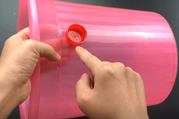 第二步:用热熔胶将塑料瓶的瓶盖粘在垃圾桶上,距离垃圾桶口下5CM左右的位置。