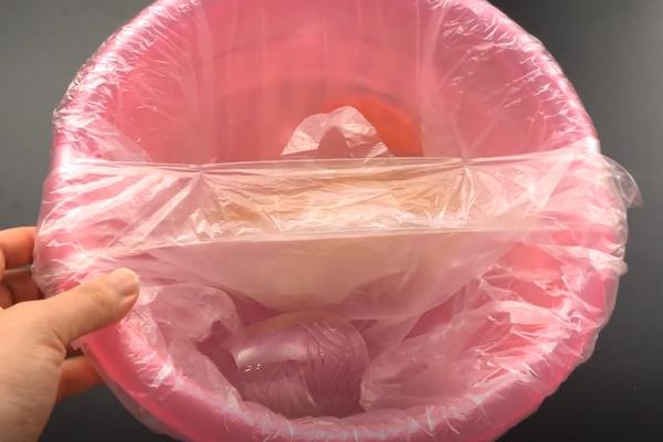 第三步:每天家里都会有买菜的塑料袋,我们可以把它放进塑料瓶里。用的时候就,这样往外抽就可以了。