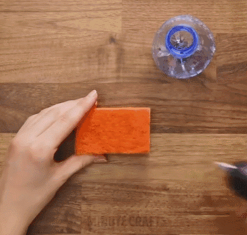 再找来一块百洁布海绵,在百洁布表面抹上胶水,将瓶底粘牢在百洁布上。