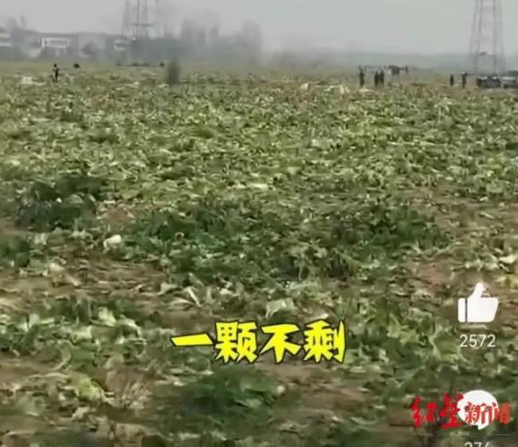视频中,一辆白色汽车、几辆大型小型三轮车上堆满了白菜,白菜地里一片狼藉,画面里一名男子称几百亩地的白菜全都被霍霍没了,“一颗都没收,一颗不剩了。”
