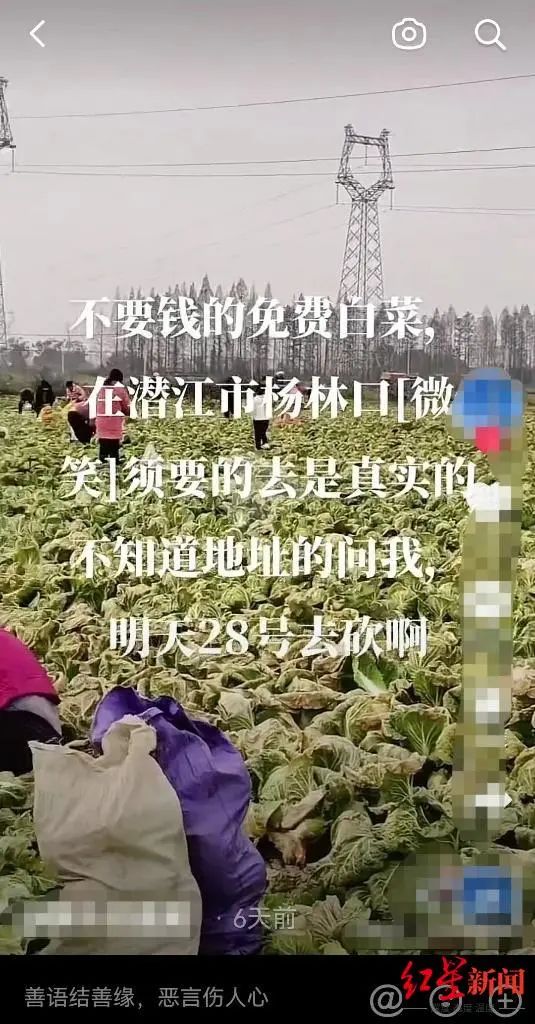 有视频发布者称,“不知道是谁家的,别人不要了。”其中,有网友曾于2022年12月28日发布视频,显示“不要钱的免费白菜,在潜江市杨林口,需要的去,是真实的。”红星新闻向该网友核实,对方称自己并非潜江市人,“是在抖音上看到了转发的,有人说是免费的,后来听说老板还报警了的。”