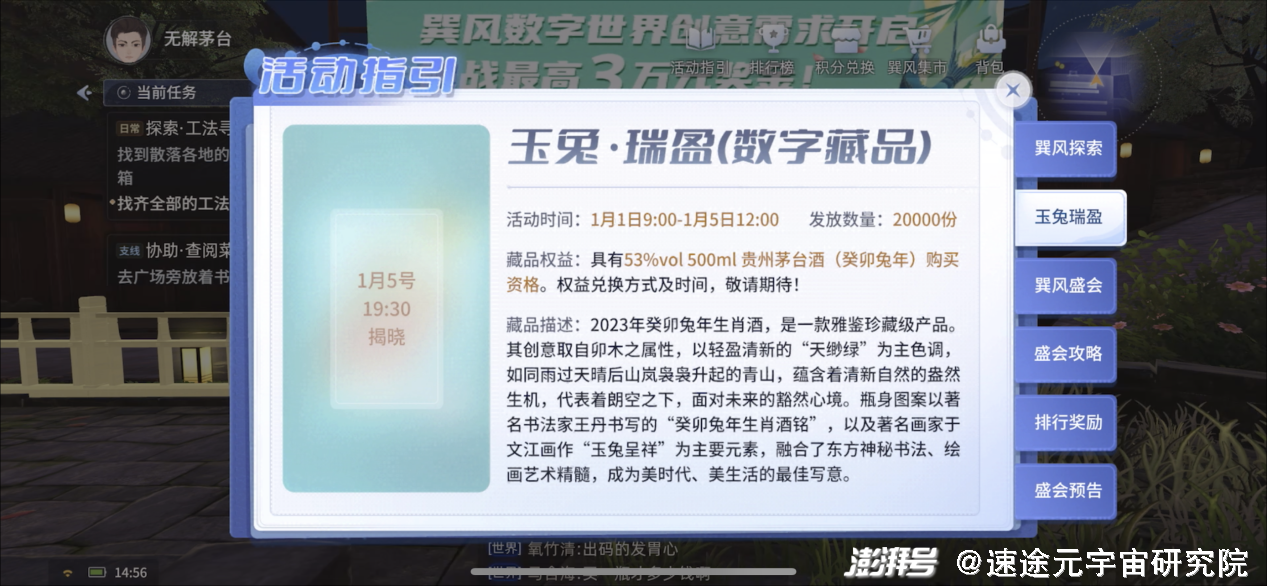 茅台元宇宙世界的核心玩法是通过做任务赚取“巽值”,“巽值”高的玩家可以获得茅台元宇宙推出的数字藏品,而数字藏品的核心权益便是可以获得53%vol 500ml贵州茅台酒(癸卯兔年)的购买资格。目前“巽值”排行榜的第10000名用户已经达到了3300以上的“巽值”,可见茅台创造了一个多么激烈的竞争环境。