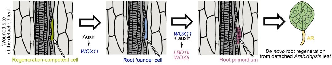总结来说,拟南芥WOX11在从离体叶片再生不定根、从受伤的初生根再生不定侧根以及在组织培养中形成愈伤组织的过程中,由生长素激活表达在创始细胞中,促进创始细胞向根原基或愈伤组织原基的细胞命运转变。