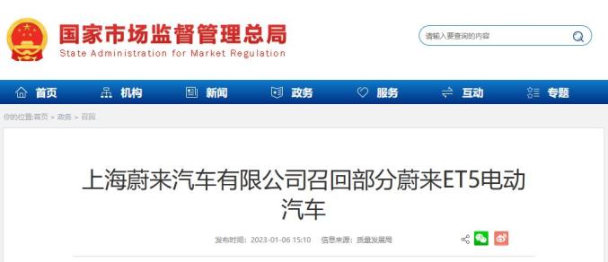 上海蔚来汽车有限公司召回部分蔚来ET5电动汽车