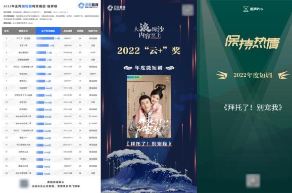 首先当然是传播的广度和深度,没有热播就不足以谈IP。以《拜托了!别宠我》系列为例,其在腾讯视频的累积播放量已突破10亿,并强势登顶云合2022年全网微短剧有效播放霸屏榜,并获得“云+”奖与“新声Pro”等第三方媒体平台年度微短剧的荣誉。