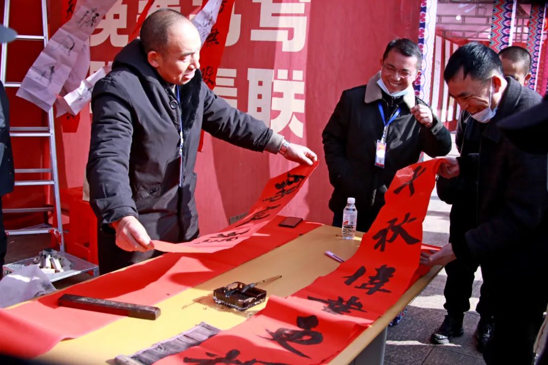 上午精彩纷呈的开幕式表演逐一登场,目不暇接。有广场舞串烧、龙船调。红彤彤的年味,吸引了不少市民围观,在锣鼓喧天的热闹气氛中,两只大狮子在人群中穿梭起舞,将市民朋友带到利川非遗展示区,这里楹联家们挥毫泼墨,在现场撰写春联免费送。