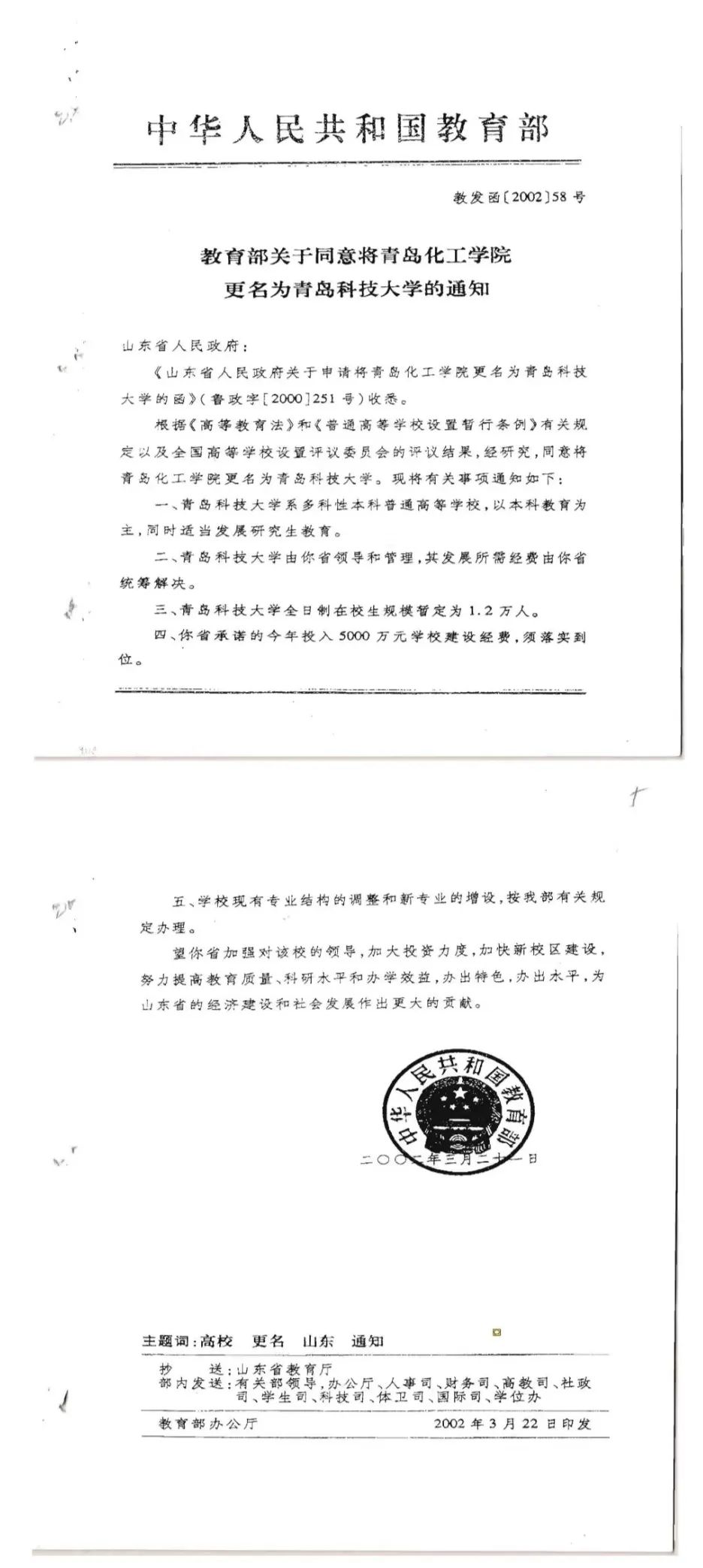 图 | 教育部关于同意将青岛化工学院更名为青岛科技大学的通知