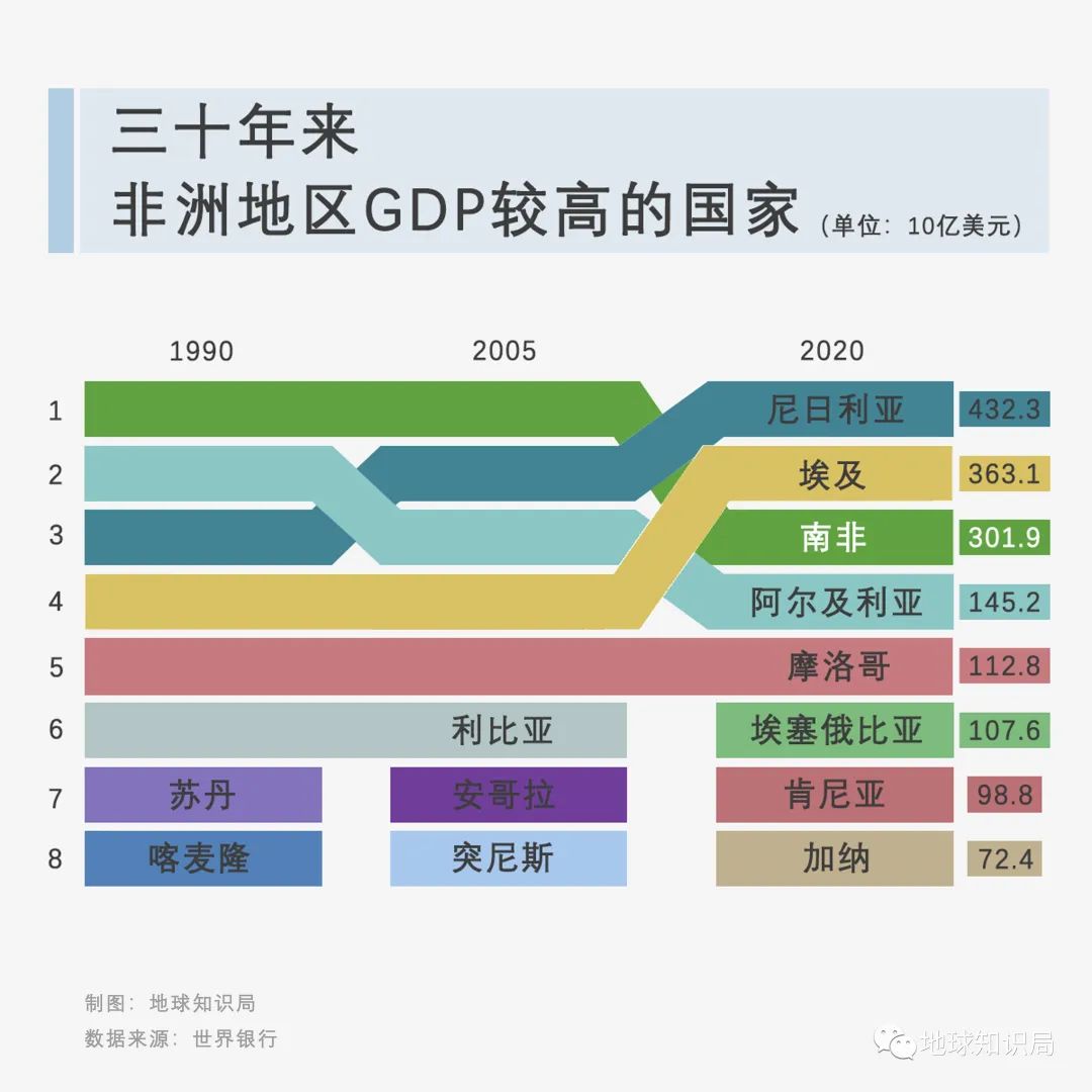 1994年,南非的国民生产总值为4221.92亿兰特,居非洲各国之冠,约占整个非洲国家国民生产总值的三分之一,超过撒哈拉以南黑非洲国家工业产值的总和。但是到了2022年,南非的GDP总量为4114.8亿美元,落后于尼日利亚和埃及,位居非洲第三位,人均GDP为6739美元,也落后于加蓬、博茨瓦纳等非洲国家。