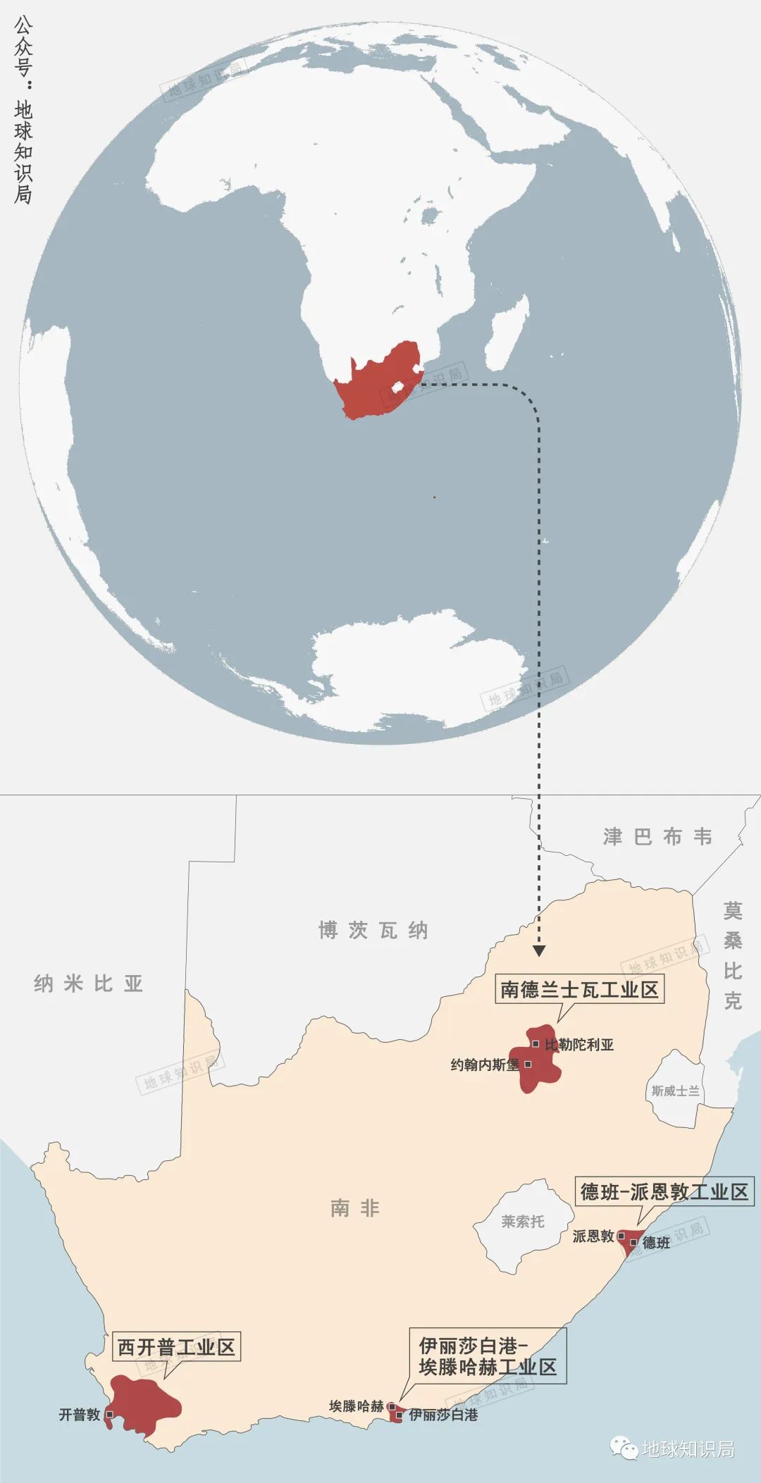 经过半个多世纪的建设,南非形成了西开普、伊丽莎白港-埃滕哈赫、德班-派恩敦(Pinetown)和南德兰士瓦四大工业区。