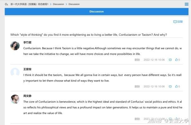 在教学中,王老师在讲授知识的同时还注重利用传统文化培养学生的价值观和人生观。用英文讲好中国课。第八单元谈到东方哲学,当讲述到人的欲望的时候,王老师谈到《道德经》里的“常有欲,以观其徼”,教育学生在学习成长过程中戒骄戒躁,学会净化自己的心灵,树立人生的方向和目标。在腾讯会议的线上课堂上,王老师利用里面的聊天页面随时和同学进行即时的交流。课堂外,她还利用微信班级群随时和同学做好沟通,耐心回答他们学习,生活,思想上的各种问题,争取在课堂外做学生的知心朋友。教学相长,师生共享一堂课。21级人工智能班的王洋同学说:“王老师的课非常有趣, 每次听她上课是一种享受, 大家非常开心。”