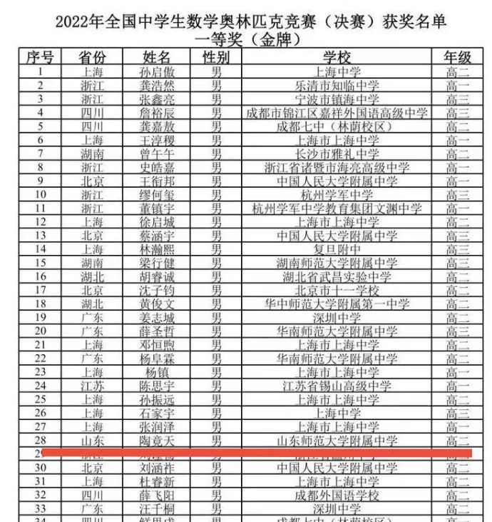在2023年1月8日中国数学会公布的2022年全国中学生数学奥林匹克竞赛(决赛)获奖名单中,山东师范大学附属中学高二年级的陶竟天同学获得金牌并入选国家集训队,成为山东省唯一入选国家集训队的学生。