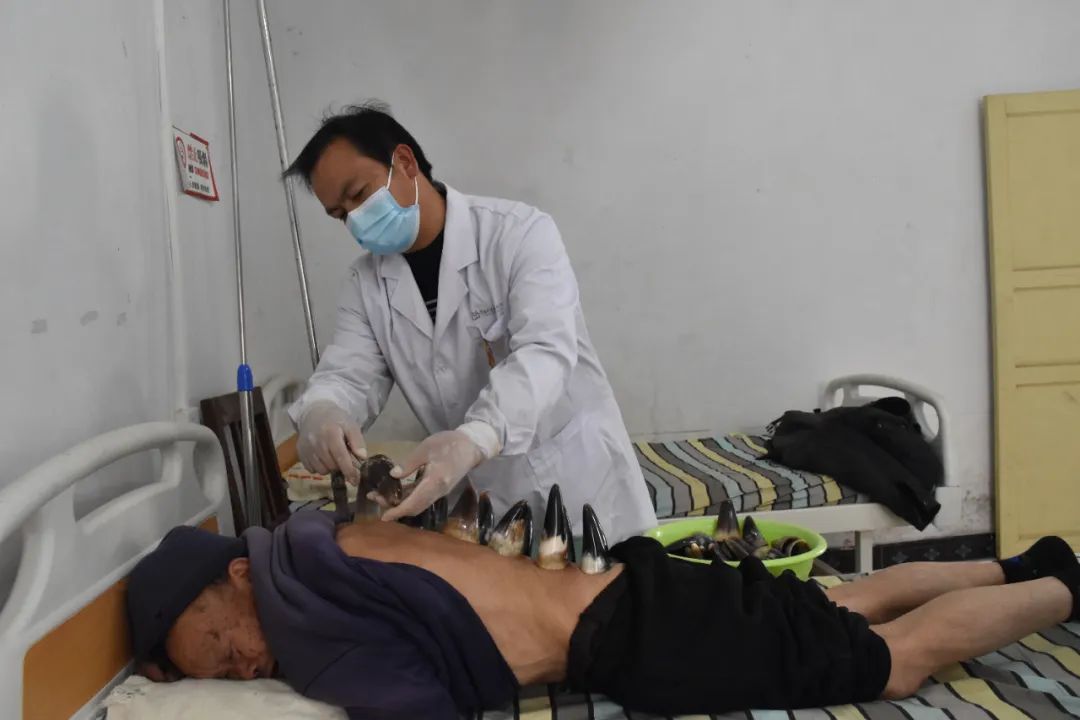 三江村的80岁村民文秉忠,是正在接受牛角罐治疗的病人之一。