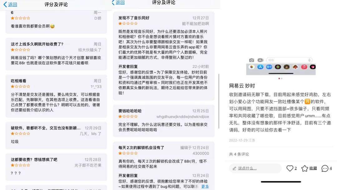 苹果应用商店和小红书上对妙时的评论此外,在小红书和微博等平台,不少网易云音乐用户在收到内测邀请后就表示了不解,“好好搞音乐不好吗?”、“网易云音乐已经是社交氛围最浓的音乐平台了,还不够吗?”、“我只想在网易云独自网抑云,别让我去社交”。也有网友在下载使用后表示,“目前感觉用户有点无礼,整体没有想象的那样干净舒适。”