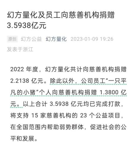 今晨,“一私募基金员工捐款1.38亿”的消息在基金圈刷屏,并登上了百度热搜。公开资料显示,该消息的第一信源来自知名量化头部私募幻方量化的微信公众号,捐了1.38亿元的是该私募一位名为“一只平凡的小猪”的员工,此外,2022年度幻方量化共计向慈善机构捐赠2.2138亿元,两者合计近3.6亿元均已完成打款。