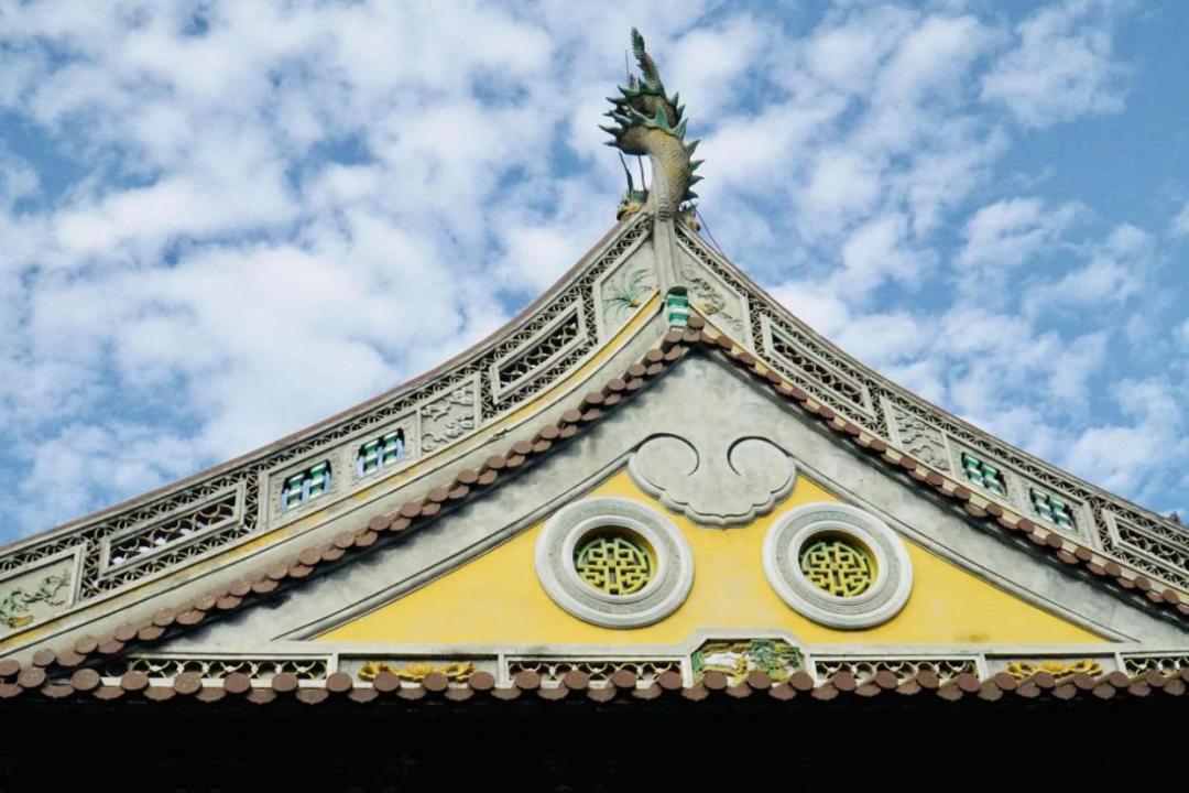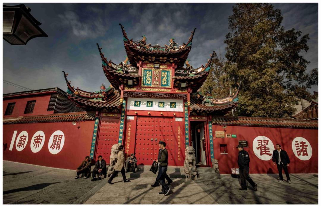 “九重宫阙晨霜冷,十里楼台落月明”,初见关帝庙,你一定会被它的华丽彩塑和复杂构造所吸引。正殿为关帝殿,屋顶重檐,四角上翘,虽凝固却显露出扑朔欲飞的动态,檐上铺红色琉璃瓦,屋脊上立脊兽神灵,檐下横梁上雕有金色花卉、龙凤祥云,正脊上题“道炁常存”,这四个字中间有两位兵将骑马赴战的石雕。关帝殿内高堂邃宇,正中供奉关公尊荣,身披金袍,英姿勃发,令人肃然起敬,墙面绘有彩色壁画,是“桃园三结义”和“忠义昭日月”的故事。登上阁楼仿佛进入洞天幽境,即将开始一场参道之行,走过桥关可见金字隶书“昨天”“今时”“明日”,抬头看见横梁上的一行字,隔一个字便正反颠倒,想要完整地读完这句话需要费上一番工夫,其中深意就依据各人理解了。