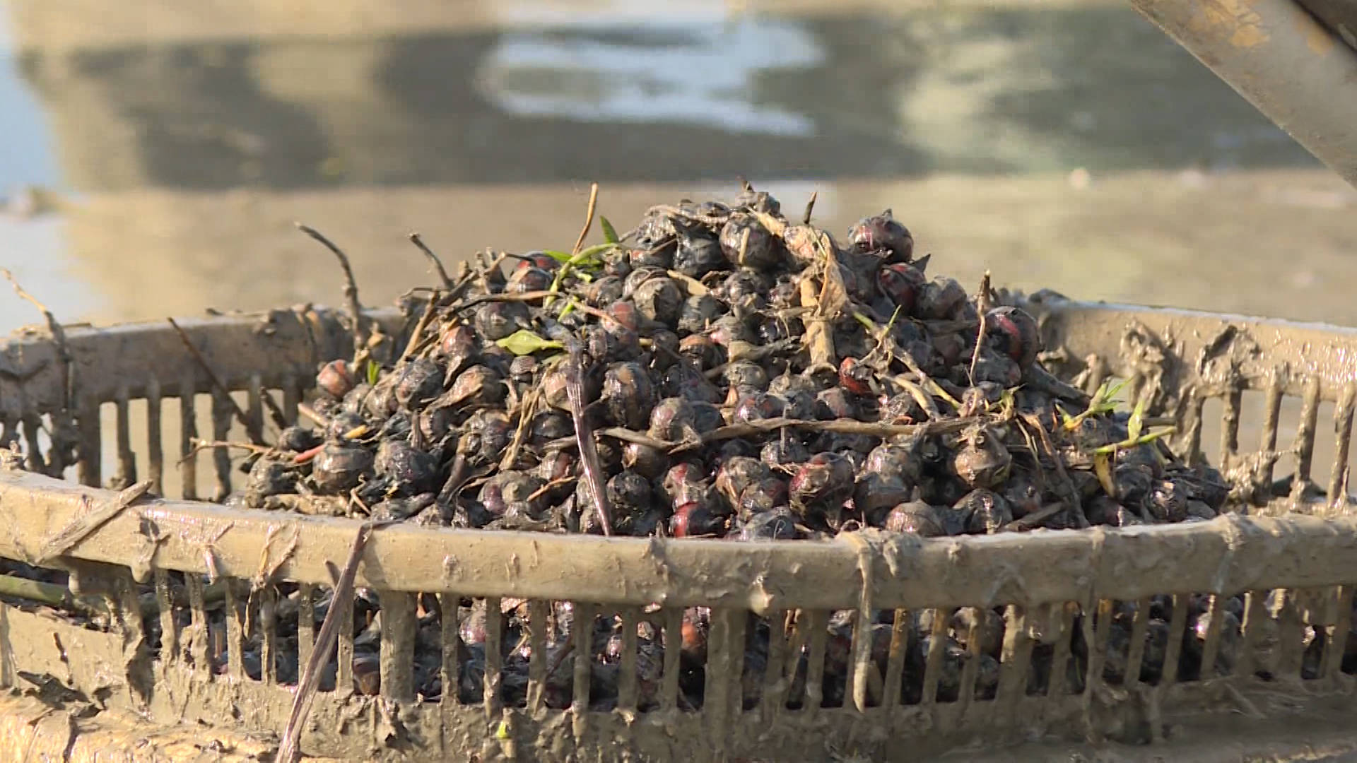 上午九点多种,记者在海陵下朗村委会珍珠马蹄种植基地看到,工人正忙于采挖马蹄,他们先是用耙田机将泥土耙烂,马蹄浮出水面,然后用网兜捞起来放在篮子里,再运到加工点进行削皮、清洗等几道工序之后,最后将马蹄放到田头冰库冷藏。