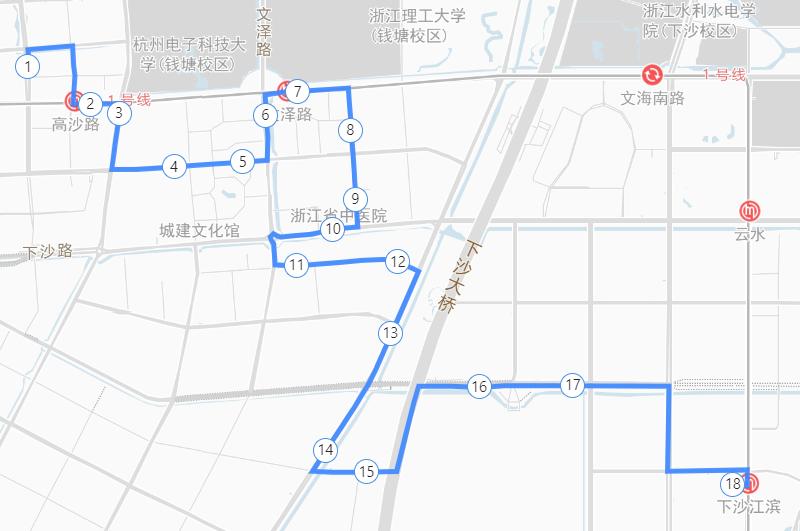 下沙江滨公交站始发,经十四号大街、二十三号大街、十二号大街、十五号路、十四号大街、十一号大街、八号路、五号路、六号大街、九号路、二号大街、五号路、四号大街、一号大街、金沙大道、银沙路至银沙路公交站。