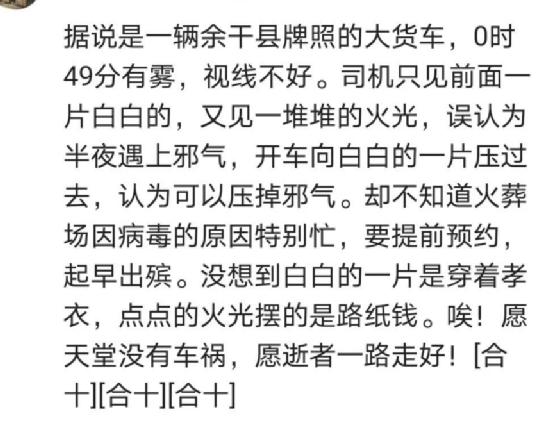 有人说是司机大晚上开车,看见前面白白的,又有一片火光。