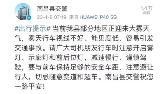 第二天一早,当地交警就做了出行提醒,大雾天气,希望广大司机开车多注意。
