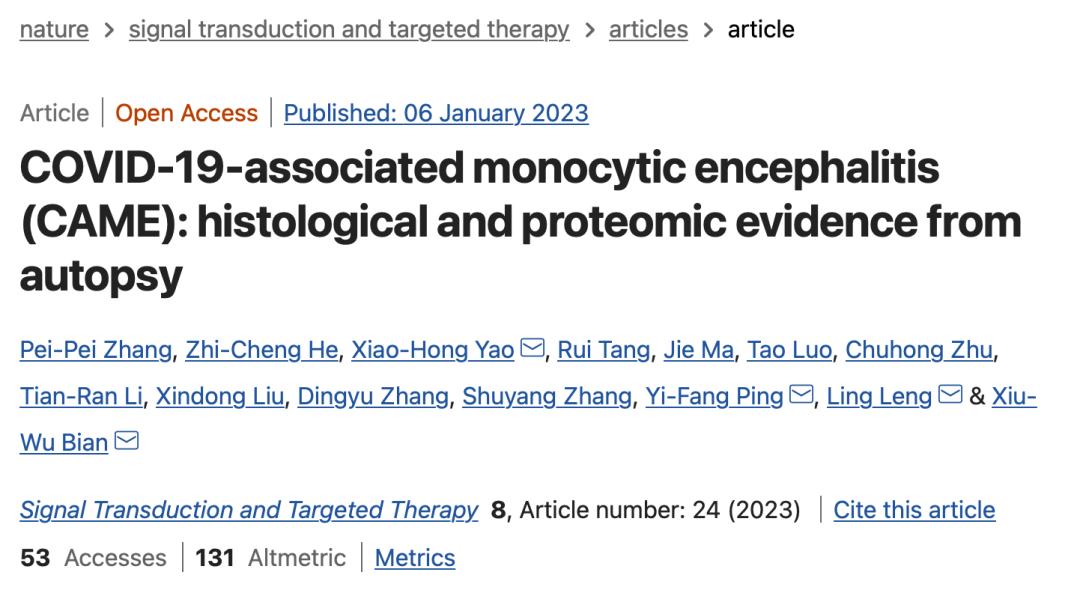 2023年1月6日,来自中国科学技术大学和陆军军医大学等单位的联合研究团队在Signal Transduction and Targeted Therapy杂志上在线发表了题为COVID-19-associated monocytic encephalitis (CAME): histological and proteomic evidence from autopsy的研究论文。作者通过对比研究老龄COVID-19和正常老龄脑的神经病理学改变和蛋白质组学图谱,确定了COVID-19相关单核细胞性脑炎(COVID-19-associated monocytic encephalitis, CAME)病理诊断及其分子病理学特征,揭示了以单核细胞为主的炎细胞浸润、小胶质细胞活化和炎性因子释放导致脑细胞及血脑屏障破坏,是CAME发生的重要机制,并可能成为COVID-19的治疗靶点。