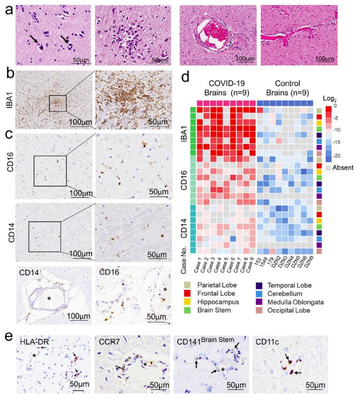 作者对2020年武汉疫情期间尸检的COVID-19脑(9例)各脑区(每例取14个脑区)进行组织病理学、超微结构、病毒检测(核酸和蛋白)检查,发现脑病变主要表现为噬神经细胞现象(neurophagocytosis)、卫星现象 (satellite phenomena)、小胶质结节 (microglia nodules) 形成,并有明显的血管炎、血管源性脑水肿及炎细胞浸润。免疫组化标记及计算机辅助的定量病理学分析结果显示,在血管周围间隙和脑实质内存在单核细胞浸润,表达CD14/CD16/CD141/CD11c/CCR7,并且呈活化表型;同时血管壁及血管周围也存在CD4/CD8、CD20阳性淋巴细胞;星形胶质细胞和小胶质细胞增生和活化表现。内皮细胞肿胀、细胞连接破坏、基底膜肿胀以及胶质膜水肿、断裂不连续。上述病理变化呈现单核细胞性脑炎特征。此外,部分患者可见灶性脑出血、脑软化、坏死性血管炎或脑炎,肺部合并有细菌性肺炎的病例可见脑膜脑炎。脑微血管内皮细胞免疫染色可见病毒蛋白阳性。