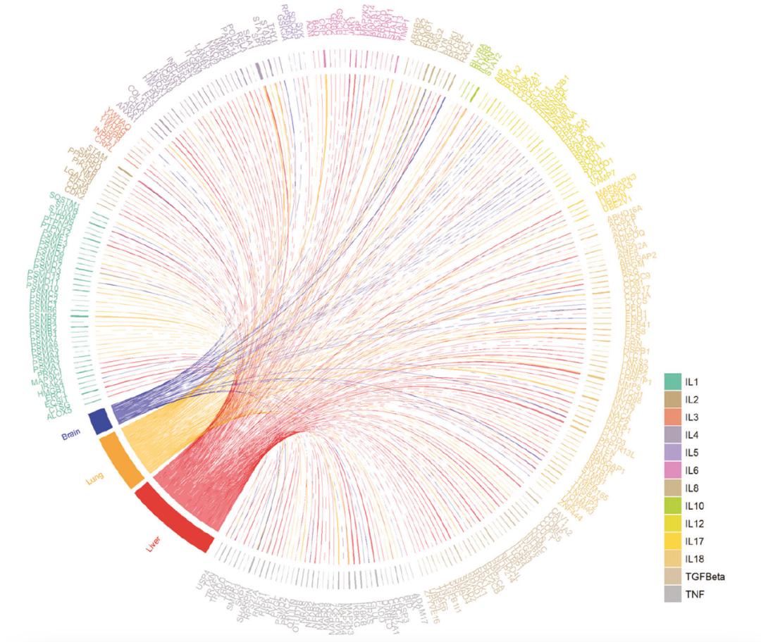 图2 COVID-19脑炎血脑屏障损伤及相关蛋白质组学改变为了验证上述神经病理损伤机制,作者原位检测了与CAME相关的炎性介质,结果发现,COVID-19脑中IL-4、IL-6、IL-8、IL-12、TGF-β和TNF-α相关通路的表达水平上调,以上细胞因子主要在血管内皮细胞、单核细胞、淋巴细胞和小胶质细胞上表达。有意思的是,以上主要炎性介质在脑与肺和肝脏中的表达趋势高度一致,表明这些因子可能参与了系统性炎症因子风暴。