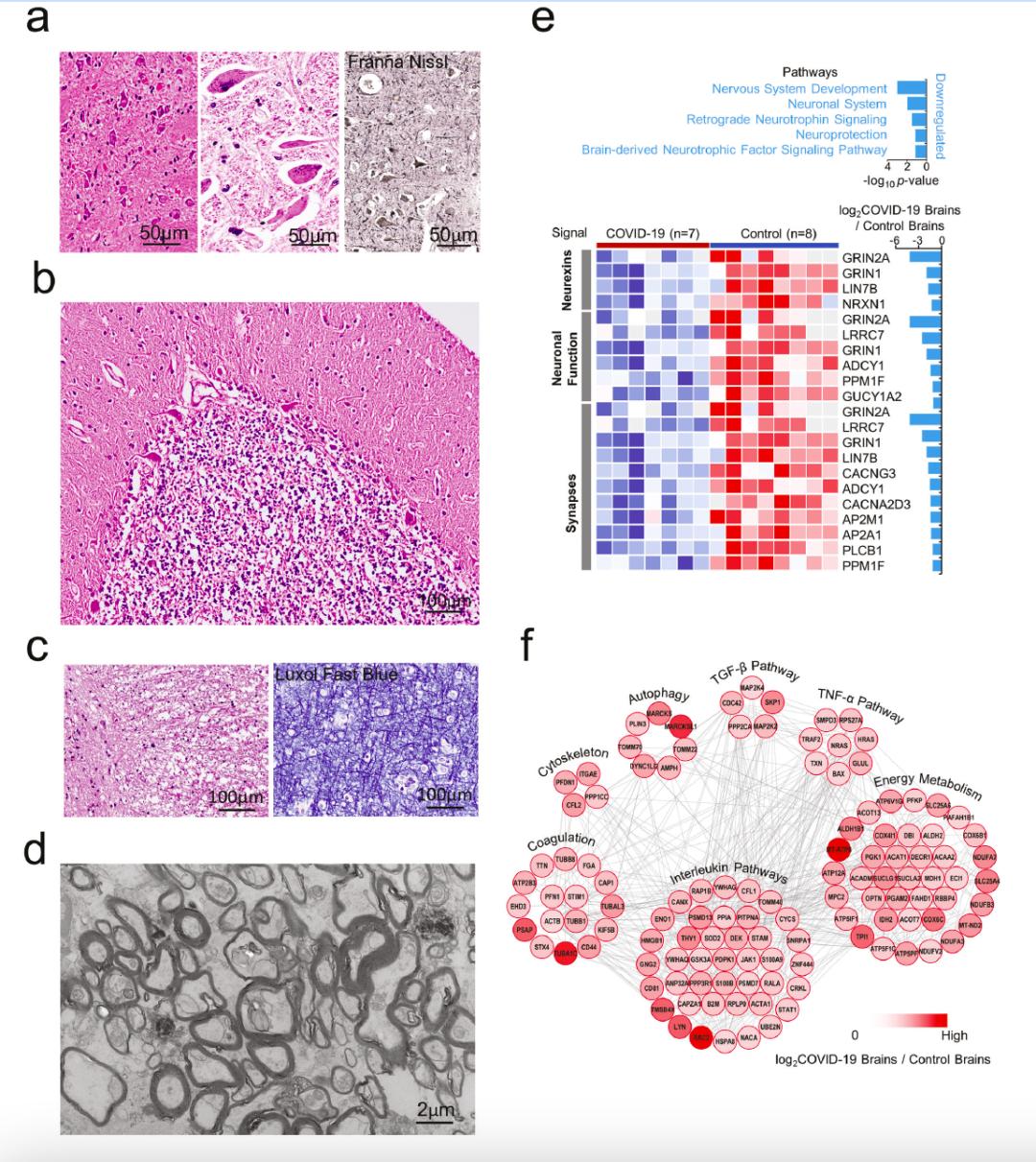 图1 COVID-19脑组织病理学改变,单核细胞浸润和小胶质细胞增生活化。为了了解COVID-19患者脑组织中炎细胞的作用机制,作者对COVID-19脑与正常脑(9例)各脑区进行蛋白质组检测和比较分析,结果显示,与正常对照脑组织相比,COVID-19脑中存在572个差异表达的蛋白。其中表达上调的294个蛋白主要富集在JAK-STAT、Toll样受体TLR1/TLR2、NFκB磷酸化、IKKs复合物活化和MHC II类抗原提呈等多种免疫反应相关的信号通路。此外,发现了可能驱动这些免疫信号通路活化的炎症因子。例如,IL-12刺激激活JAK-Stat通路的蛋白(PITPNA, CDC42, RAP1B, CFL1, RPLP0, SNRPA1, SOD2, RALA, PPIA);促使单核细胞趋化蛋白1产生的蛋白(HMGB1和APOD)等。蛋白质组学的结果支持COVID-19患者脑中的小胶质细胞和星形胶质细胞活化后释放的炎性因子可能引起脑损伤,影响脑的细胞连接、能量代谢和认知记忆等功能。