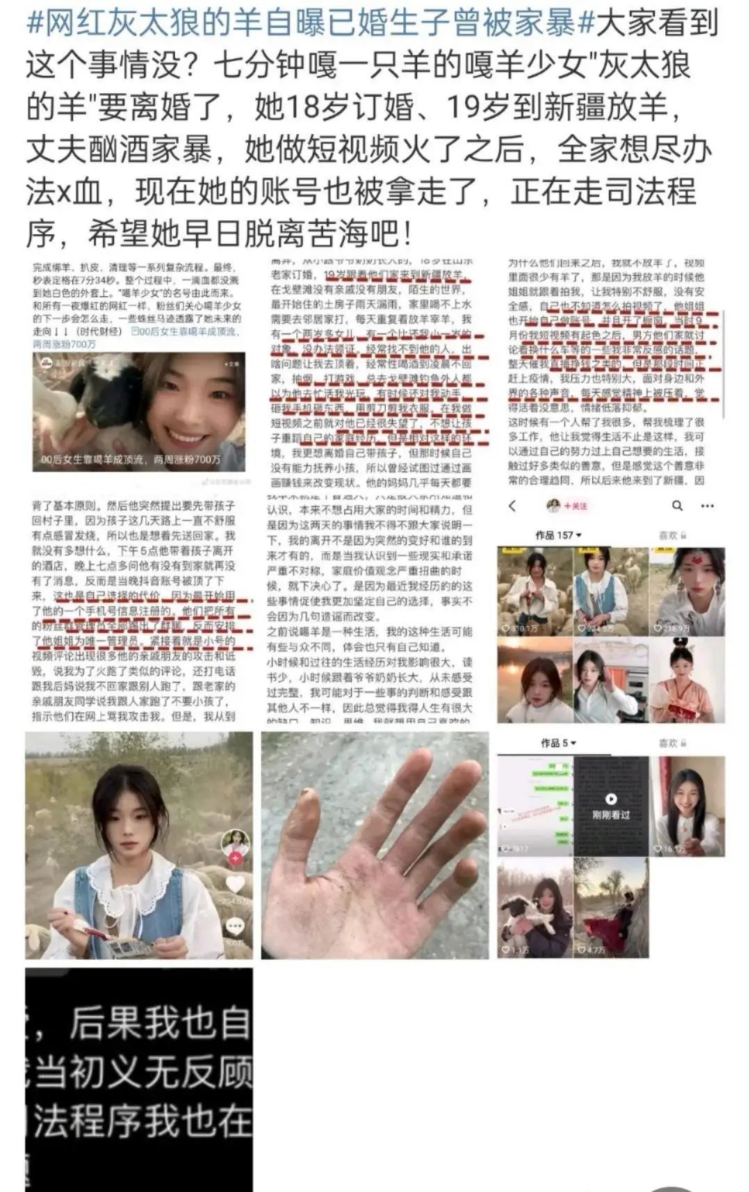 2022年的最后几天,网红灰太狼的羊(真名惠然)的生活牵动了无数网友的心。在去年八月,这位网红因为干净利落的杀羊和清秀外貌之间的巨大反差在短视频平台一夜走红。12月30日,该网红发布消息称自己被丈夫家暴,当成挣钱工具,此消息一出很快引发大量网友关注,一位在屏幕前漂亮杀羊的年轻女子屏幕外竟然忍受着丈夫的家暴,不少网友开始担忧惠然的人身安全,并要求其丈夫交还账号。