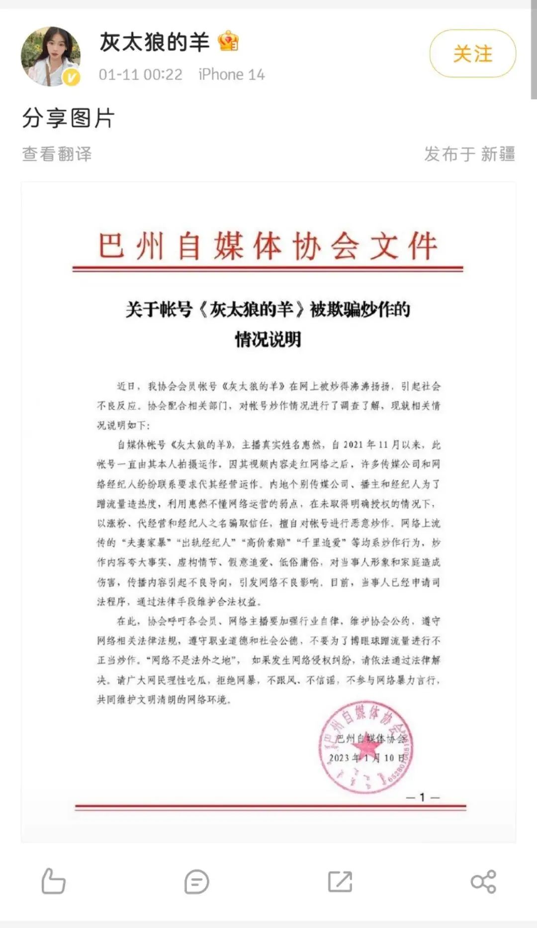1月11日,这起闹剧以惠然的声明暂时告一段落,灰太狼的羊账号发布了一分来自巴州自媒体协会的红头文件,对关于账号“灰太狼的羊”被欺骗炒作的情况做了说明。在《说明》中表示,该账号进行了调查了解后发现,其账号一直由主播本人运营,在主播走红后,有许多传媒公司和网络经纪人纷纷联系其要求代运营,个别传媒公司、博主经纪人为了蹭流量、造热度,利用惠然不懂网络运营的弱点,在未取得明确授权的情况下,以涨粉、代运营和经纪人之名骗取信任,最终在网上炒作出了“夫妻家暴”“高价索赔”“出轨经纪人”等事件,其传播内容引起不良导向。