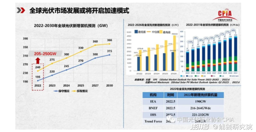 在市场规模方面,二者不在同一个量级上。光伏机构国际能源署光伏电力系统项目(IEAPVPS)再度调高2022年装机预期,2022年可能会上升到260GW。预计到2030年,每年新增光伏装机容量将翻四倍以上,达到650GW。