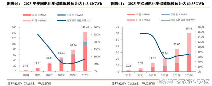 中信建投预测,欧洲电化学储能/户用储能市场在2025年规模将达到60/33GWh,2021-2025年复合增速达80%/80%。