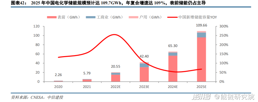 中信建投预测,中国电化学储能市场在2025年新增规模将达到109.7GWh,年复合增速达109%;表前/工商业/户用储能将分别达到96/10.6/3.1GWh,年复合增速达114%/87%/73%。