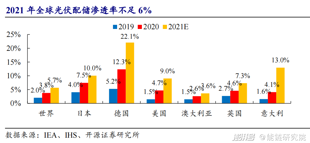根据IHS和IEA统计,近十年全球累计光伏配储比例逐年上升,2021年光伏配储渗透率已经达到了5.7%,仍然处于较低水平。分区域来看,目前仅有意大利和德国等欧洲地区渗透率达到了10%以上,其中德国渗透率超过了20%。不过从全球范围内可以看出包括美国、澳洲等在内的多个国家,其光伏配储渗透率仍不足10%,全球储能渗透率仍有很大的提升空间。