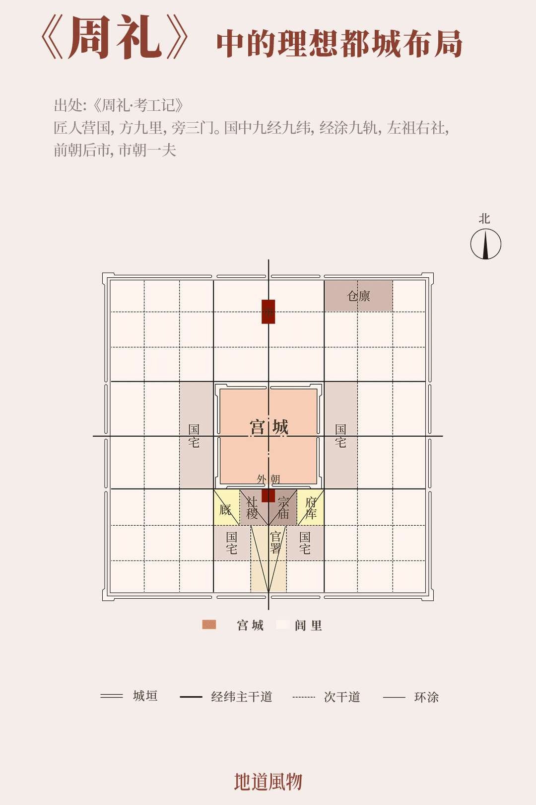 早在战国时期,《周礼·考工记》就提出了一套完备的都城营造手法。书中将帝王居住的宫殿设定为都城规划的基准点,仿佛夜空中岿然不动的北极星,接受着众星的拱卫与朝拜。这是自称为“天子”的帝王从天界向人间,至高无上的权力投影。
