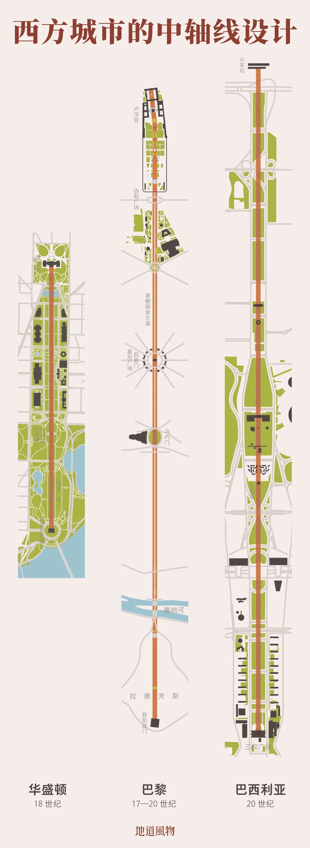 如果我们将目光投向世界,在遥远的欧洲与美洲,巴黎、华盛顿等一系列西方城市也具有着与北京类似的中轴线布局,由一条轴线连接起城市的各个功能区块。人文主义的萌芽,在这条轴线上生长。
