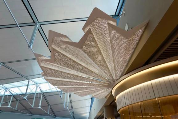 新年来临,刚过上海虹桥机场T2航站楼安检区的旅客,只要抬头向右侧屋顶望去,便会被一把灵动的“中式折扇”吸引目光:数褶聚清风,飘似鹤翻空。“扇骨”线条婉转舒缓,层层波纹连绵起伏;“扇叶”作镂空处理,仿佛穹顶落彩蝶,诗意翩跹。