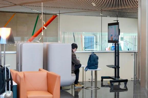 座位款式与颜色有着多样化设计,兼顾便利性与私密性1月4日上午,记者在现场采访获悉,在V23休息室试运营阶段,每天有超过1500名旅客在这里享用美食、短暂休憩。站在人来人往的V23休息室中庭核心区域,记者环视四周,发现早高峰时段的东航休息室几乎座无虚席。