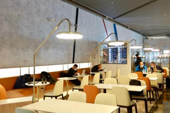 大量落地灯为商务旅客照明V23休息室设计了旅客“最短动线”,共有两个出入口和一个单向下行出口。旅客完成安检后,右转即可抵达主入口。休息室门口巡视岗的东航地服部工作人员在旅客靠近时便会迎上前来,为其指路答疑:“请问您乘坐几点的航班?”“您的航班即将登机。”……在他们背后,多块航显大屏遍布休息室各个角落,不管旅客选择在哪里就坐,都能看到自己将要搭乘航班的信息,避免错过登机时间。两侧出入口的咨询台旁也设有温馨提示栏,提醒旅客“您目前所在位置步行至61号~64号登机口需用时7分钟~9分钟,步行至32号~35号登机口需用时12分钟~15分钟……”